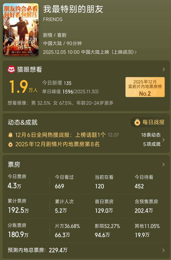 但这部电影起码有破千万的可能,不像另一部电影《我最特别的朋友》,上映5天了,票房才190多万。