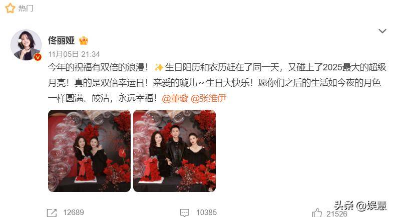 今年的生日对董璇来说格外有意义。正如佟丽娅祝福里写的那样,这一天阳历和农历重合,又遇上了2025年最大的超级月亮,是双倍的浪漫与幸运。“亲爱的璇儿,生日快乐!愿你们之后的生活如当晚的月色一样圆满、皎洁,永远幸福!”
