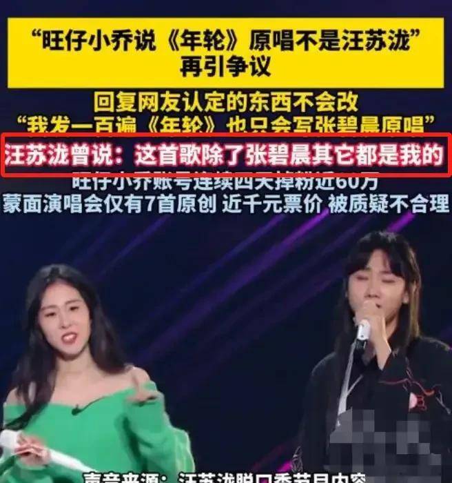 回溯风波起源,一切始于网红直播中的一句“张碧晨是《年轮》唯一原唱”。事实上,这首《花千骨》经典OST由汪苏泷词曲全创。为平息事端,汪苏泷方起初温和回应,认可“双原唱”形式。