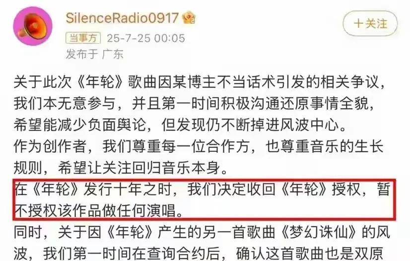 此举引发汪苏泷方更为果断的回应——直接收回歌曲版权。张碧晨演唱的《年轮》版本随之从各大音乐平台下架,那曾经萦绕在无数剧迷耳畔的经典女声,从此与她再无公开演唱的缘分。