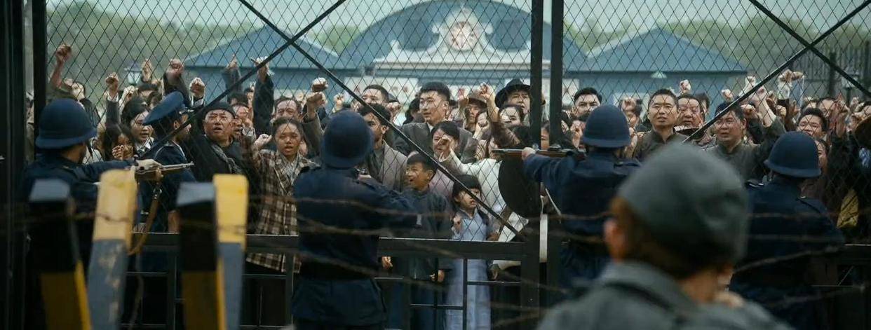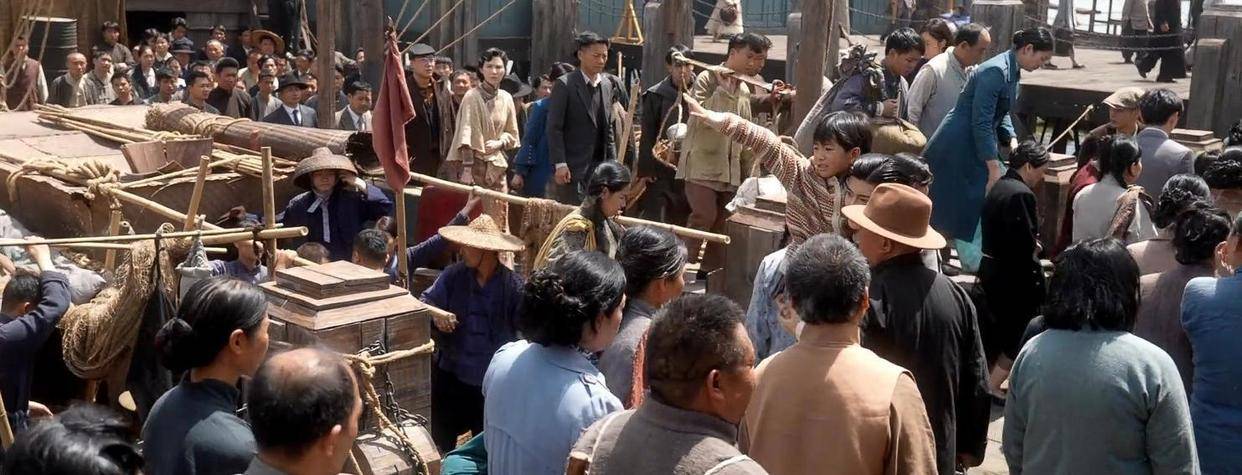 预告片中,那场景里所有难民都挤在码头上,有的人扛着扁担走,有的人在拉着车子带货,货物上还夹杂着用来出海捕鱼的渔网。