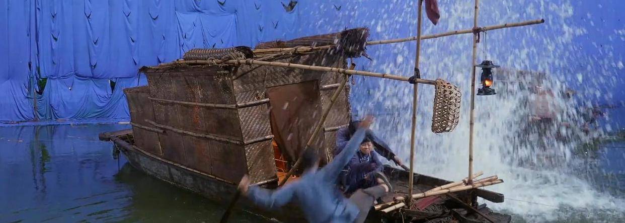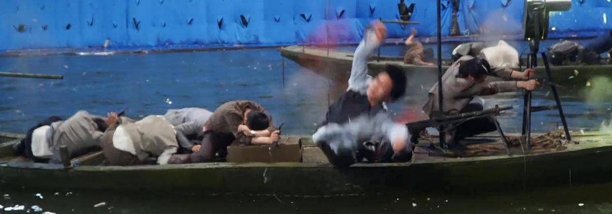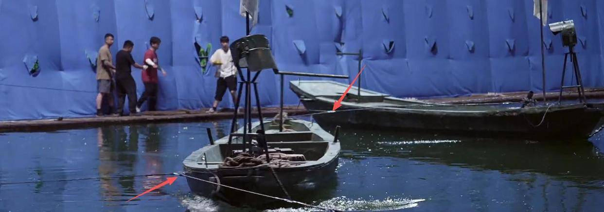 演员就摆在那艘船上,周围的水被炸得四散飞溅,人员也跟着掉进水里,都是实实在在的动作场面。
