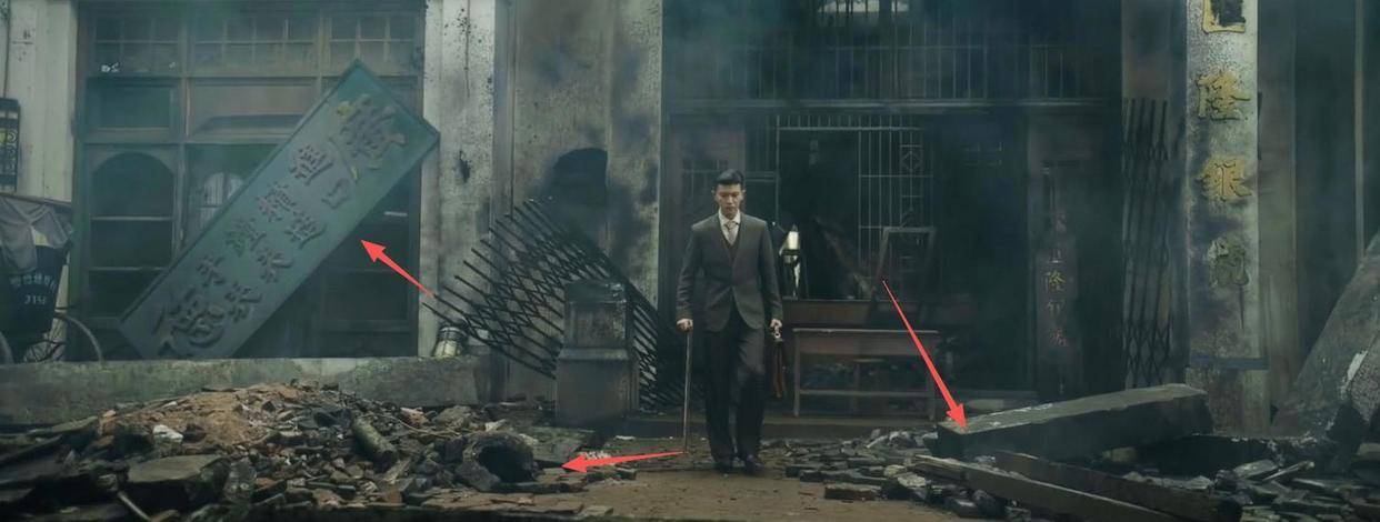 轰炸机飞过住户,所有东西都在硝烟中化为灰烬,地面上只剩下倒塌的砖瓦和掉落的招牌,整场混乱的氛围一下子就到位了。