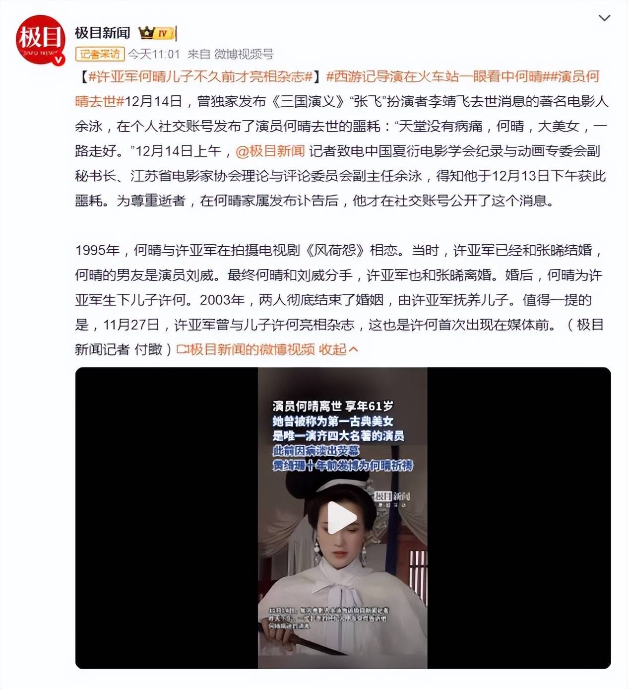 12月14日,一则噩耗在娱乐圈悄然传开。曾独家发布“张飞”李靖飞去世消息的著名电影人余泳,在社交账号公布了演员何晴离世的消息:“天堂没有病痛,何晴,大美女,一路走好。”据余泳向媒体透露,他于13日下午得知此讯,为尊重逝者,一直等到家属发布讣告后才对外公开。