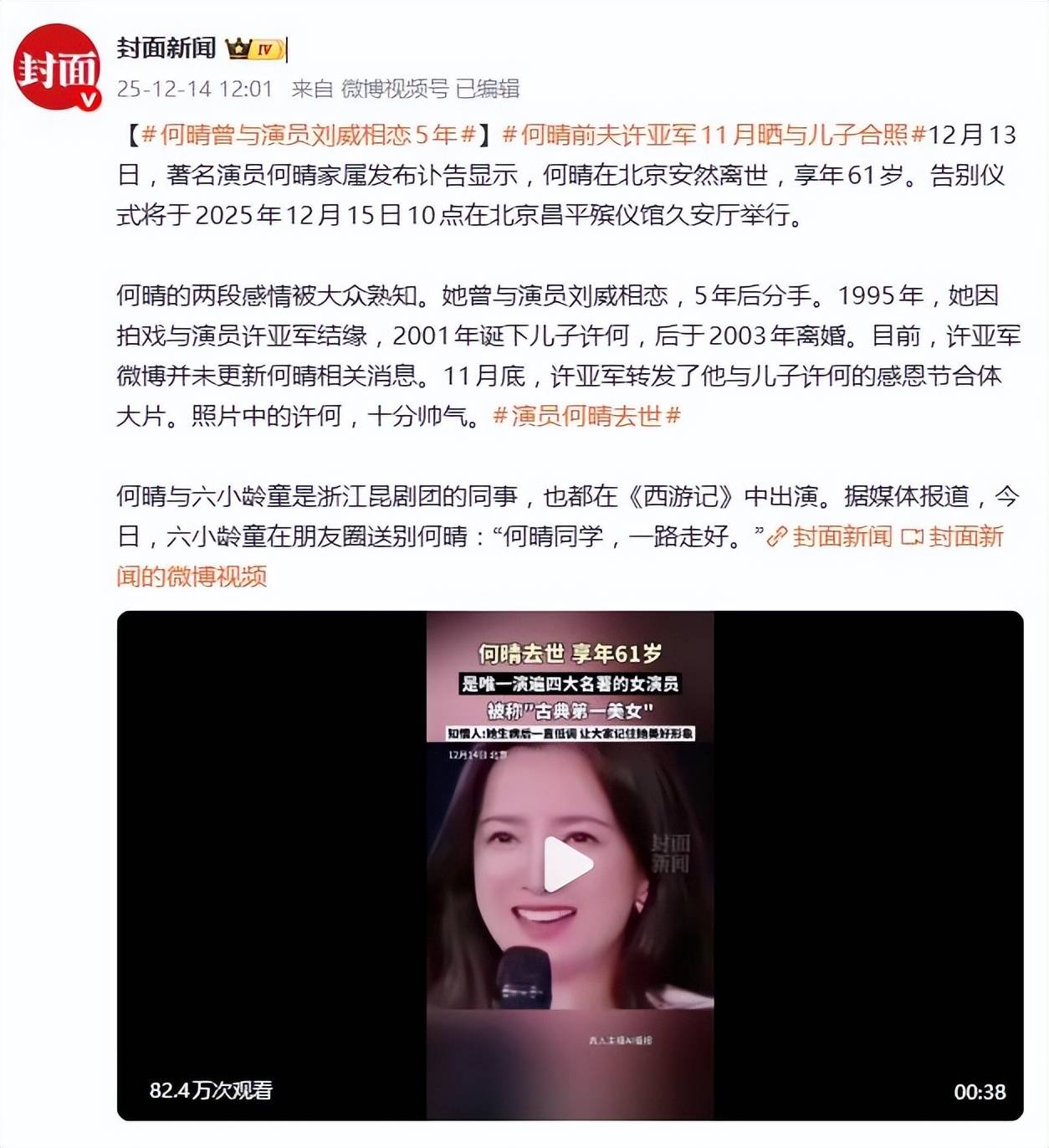 这位被誉为“古典第一美人”、唯一演遍四大名著的女演员,最终因脑瘤复发,于北京安然离世,享年61岁。告别仪式定于12月15日举行。消息传出后,曾在《西游记》中合作、同为浙江昆剧团出身的六小龄童,也在朋友圈发文送别:“何晴同学,一路走好。”