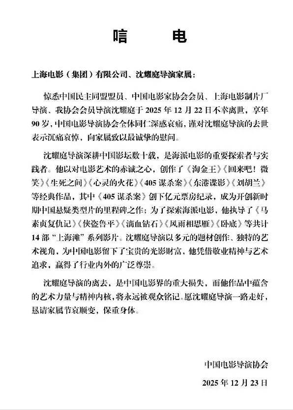 2025年12月22日,上影厂著名导演沈耀庭不幸在上海病逝,享年90岁。