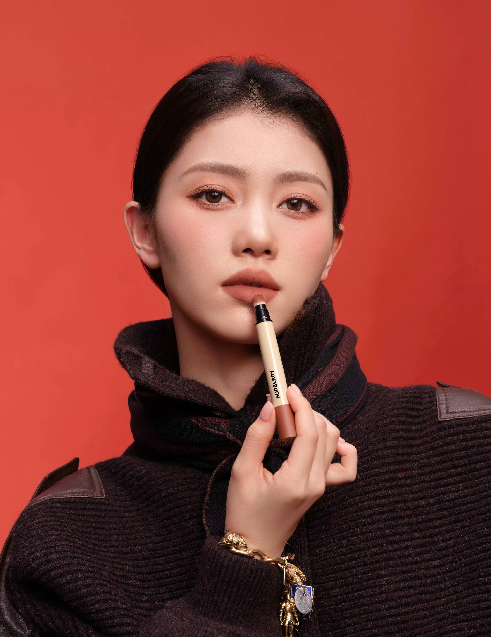 沈小婷颈间戴格纹丝巾增添调皮色彩。