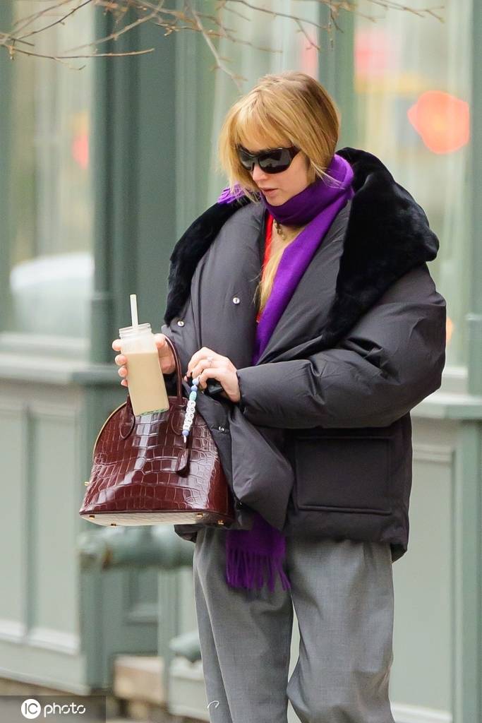 在外出时,她身着一件黑色羽绒服、戴了一条紫色围巾,搭配宽松的灰色阔腿裤和一双雪地靴,还戴了副太阳镜,拎着一个酒红色的手提包作为配饰。