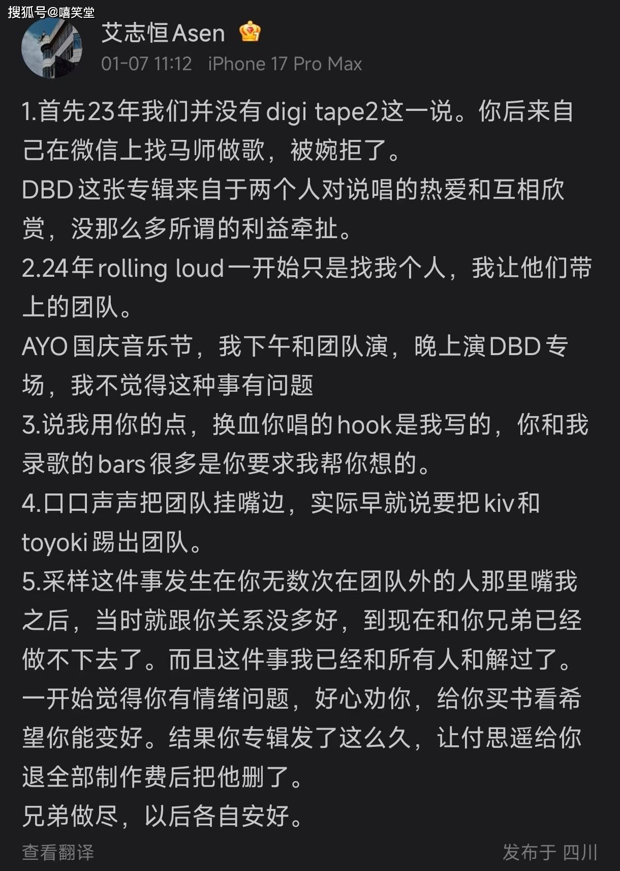 “一开始觉得你有情绪问题,好心劝你,给你买书看希望你能变好。结果你专辑发了这么久,让付思遥给你退全部制作费后把他删了。兄弟做尽,以后各自安好”