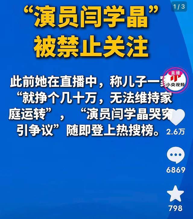 2025年12月29日下午,闫学晶在直播中为儿子"哭穷"。