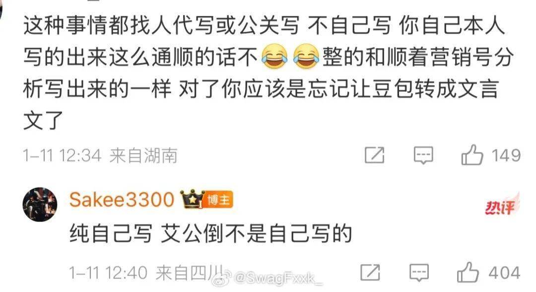 有网友质疑Sakee写不出来这么通顺的话,是让豆包写的,Sakee回应表示纯自己写,艾公倒不是自己写的。