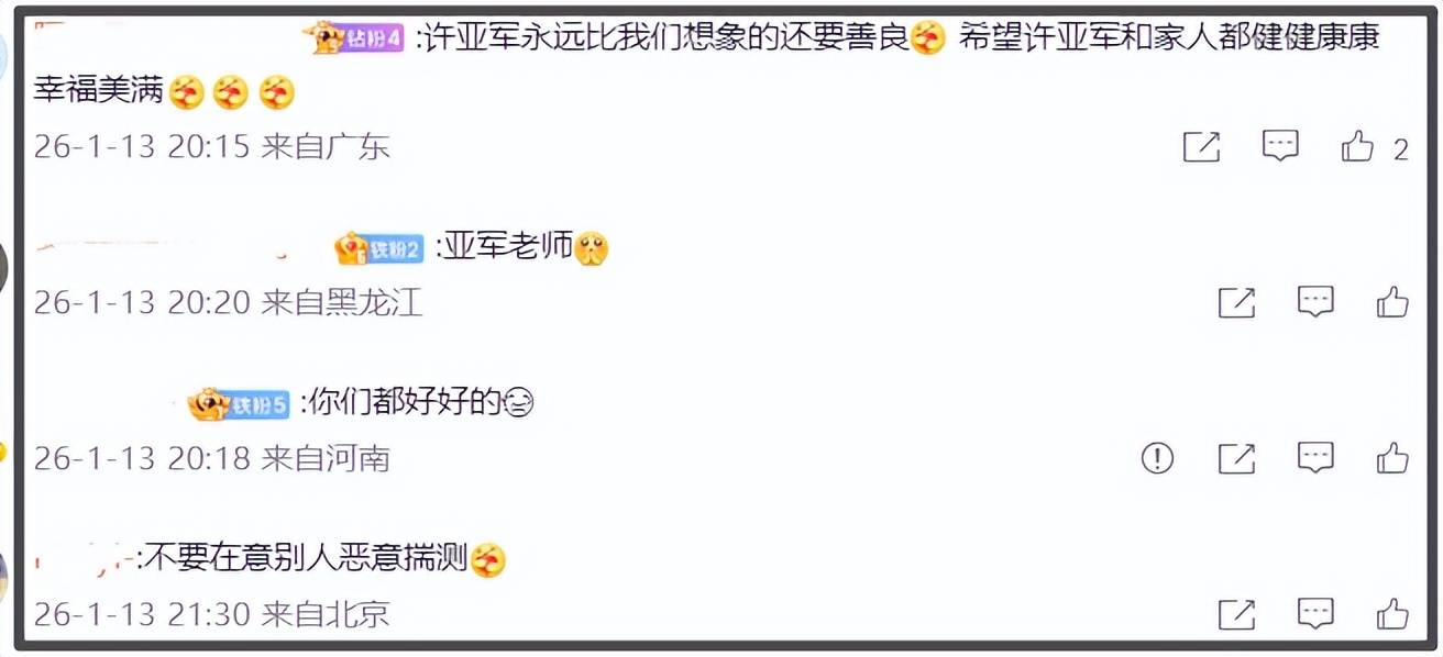 随后,许亚军火速在评论区留言“爱你我的仔”,许何也回了爱心表达爱意。从许何和许亚军的互动来看,双方似乎是有达成共识,不然不会回复那么及时,且用语跟缅怀何晴没有一点关系。许亚军的表达完全是秀父子情。