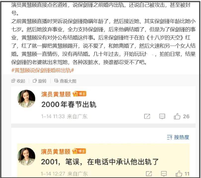 最近指控保剑锋隐婚出轨的女演员黄慧颐再次发文,哀诉自己被逼到没生路,直言自己不再保留,终于站出来手撕保剑锋了。