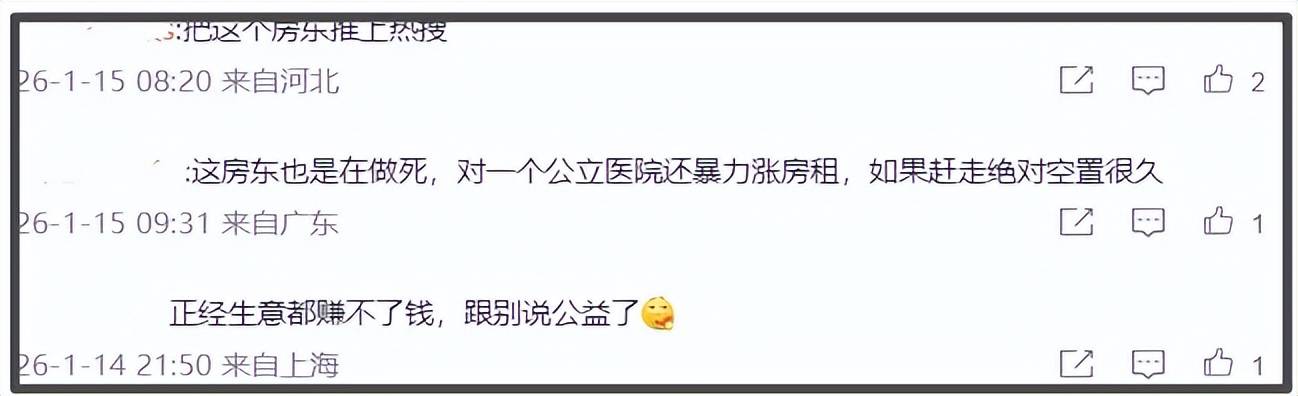 了解完李亚鹏整个欠租风波后,有很多网友认为房东涨租的行为不厚道,于是试图用舆论倒逼房东减租。许多网友称市场经济涨价合理,但是涨一倍就是趁火打劫,毕竟医院对面的房租3块钱,李亚鹏的医院7块钱,一点都不合理。所以有网友建议把房东推上热搜,还希望相关部门对其查税。
