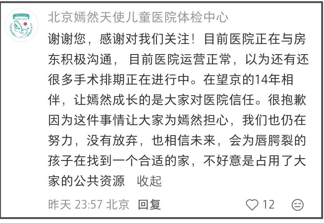 与此同时,嫣然天使医院官方账号也在每个声援支持他们的评论区留言感谢,还表示医院手术排期正常运行,会给所有病患找到一个家。