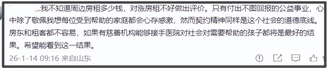 在采访中,他坦诚续签合同是自己的商业失败,也认同网友对他“投资能力差劲”的调侃,也表示法理上要遵循法院的判定,但情理上还是忍不住埋怨“欠的都是涨的租金”。同时,他也透露医院这些年给11000名唇腭裂儿童做过手术,其中7000名是全额免费,4000多名是家长们自己坚持承担。