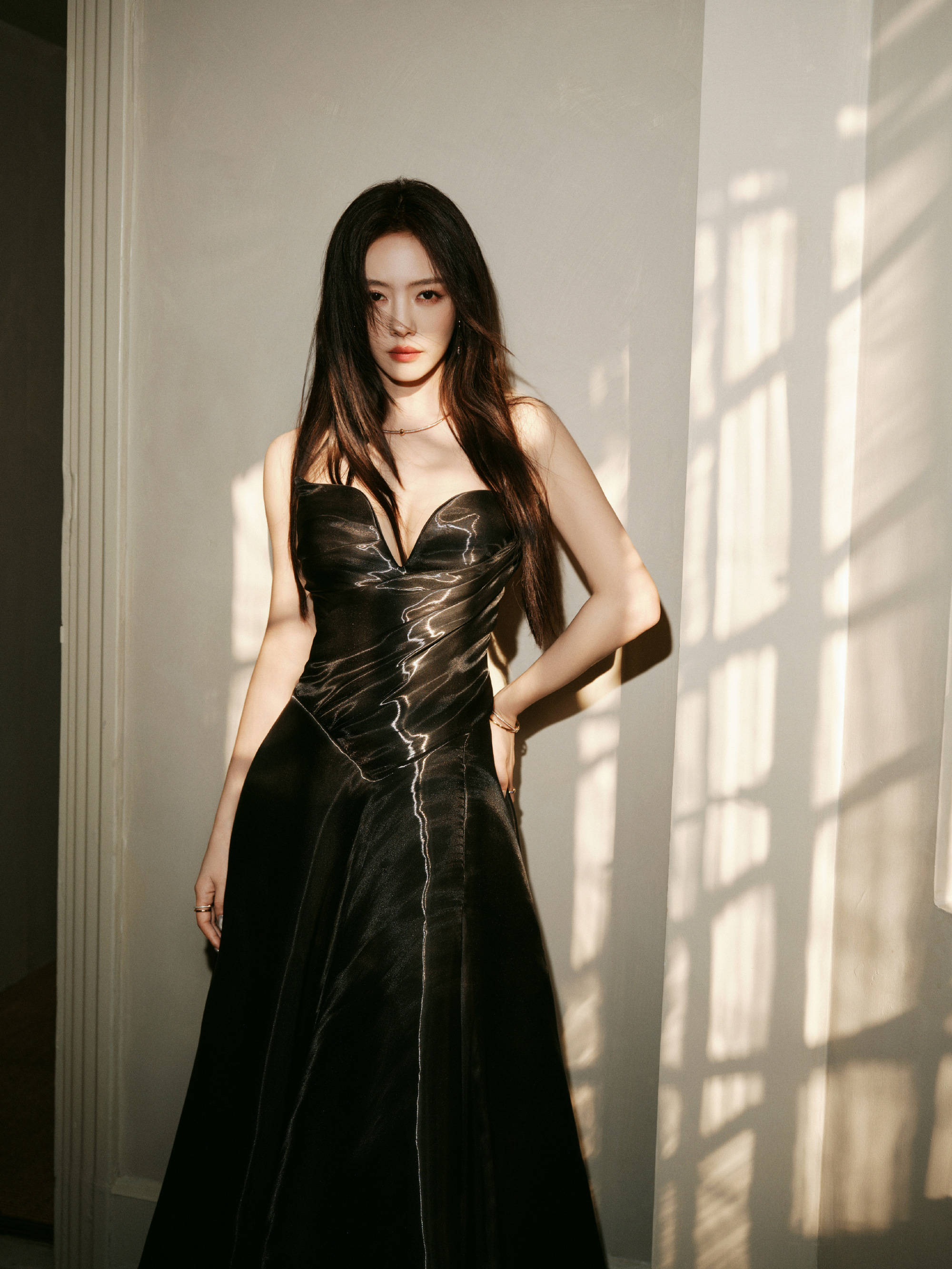 蔡文静穿黑色抹胸裙又美又飒!