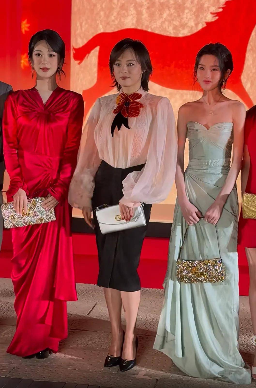 杨紫穿了一条皱褶红裙亮相,搭配超大的耳环,看着很喜庆。不过总觉得大红色的裙子不是那么好驾驭的,对她来说有些成熟了,尤其是她还拿了一个金银色的包搭配红裙,遮住脸的话会以为是40+女明星的穿搭。其实这一身造型更适合那些明媚大气的40+的女明星穿,比如刘涛、蒋勤勤等,更能穿出那种“国泰民安的美”。