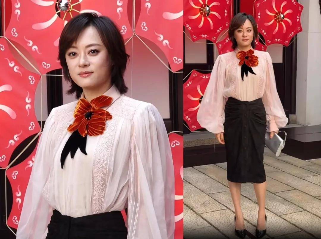 孙俪以往的活动造型,好看的占比很少,这次她穿的是垫肩白色蕾丝长袖衬衫和黑色半身裙,领口还有一朵丝绒大红花装饰,又贡献了一套让人夸不出口但也不至于很难看的造型。如果说这朵花是为了增添复古氛围感,那她的妆发也应该走复古风,可她的妆发是日常的,所以看起来既不复古又不日常,反正就是看不太懂。