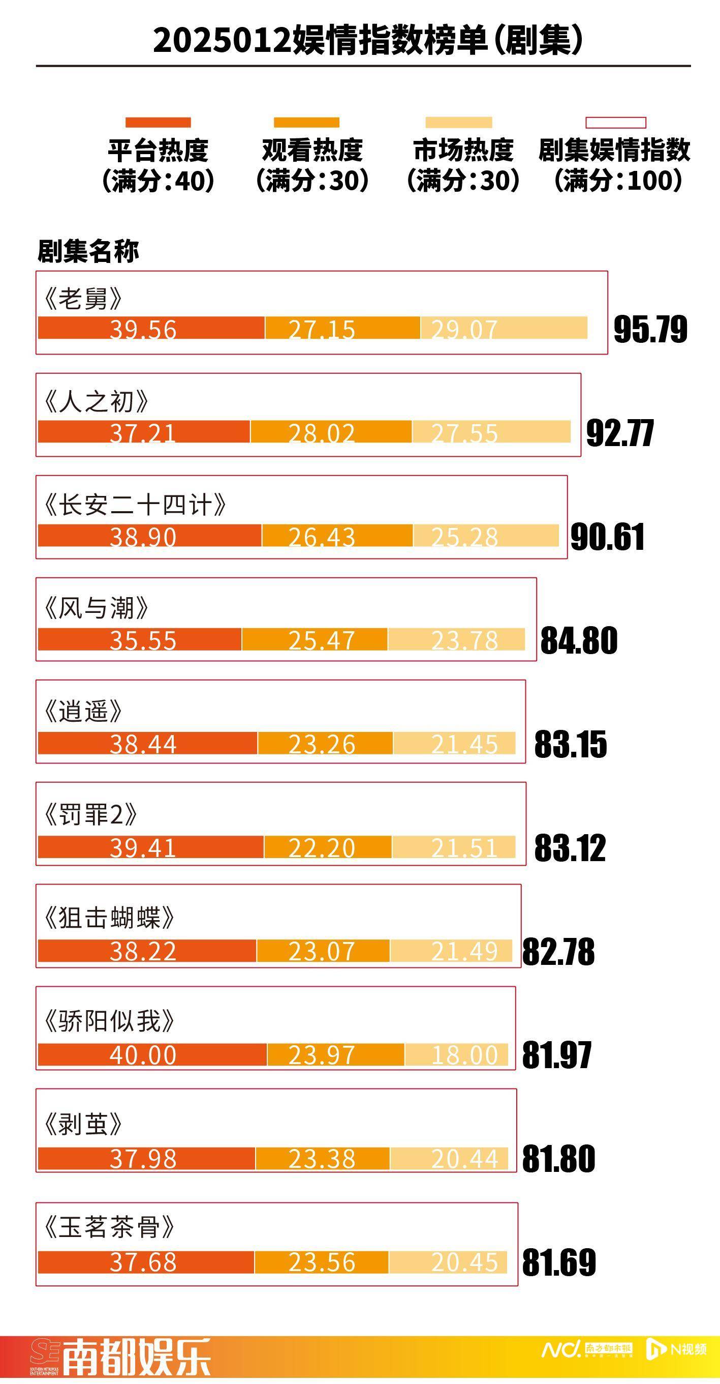 一元复始,万象更新!进入2026年,多部备受关注的热播剧集与综艺登上最新一期娱情指数。在剧集分榜,时代剧《老舅》以超95分的高分登顶,《人之初》《罚罪2》《剥茧》等多部犯罪悬疑剧强势上榜。而在综艺分榜,三部户外旅游类综艺《现在就出发 第三季》《宇宙闪烁请注意》《奔跑吧·天路篇》占据三甲,在争议声中迎来收官的《再见爱人 第五季》同样跻身分榜前十。