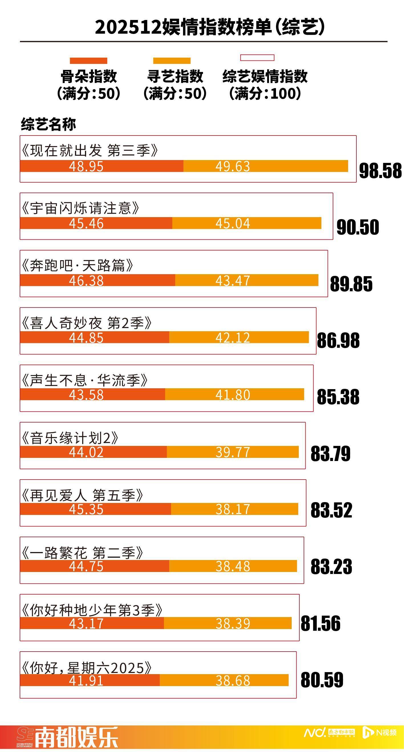 在综艺分榜,三部户外旅行类综艺占据了三甲,其中《现在就出发 第三季》实现三连冠。新开播的《宇宙闪烁请注意》凭借爆笑的游戏任务和强大的嘉宾阵容,排名次席。老牌户外竞技类综艺的最新篇《奔跑吧·天路篇》则排在第三位。值得注意的是,迎来收官的《喜人奇妙夜 第2季》和《再见爱人 第五季》也顺利上榜。