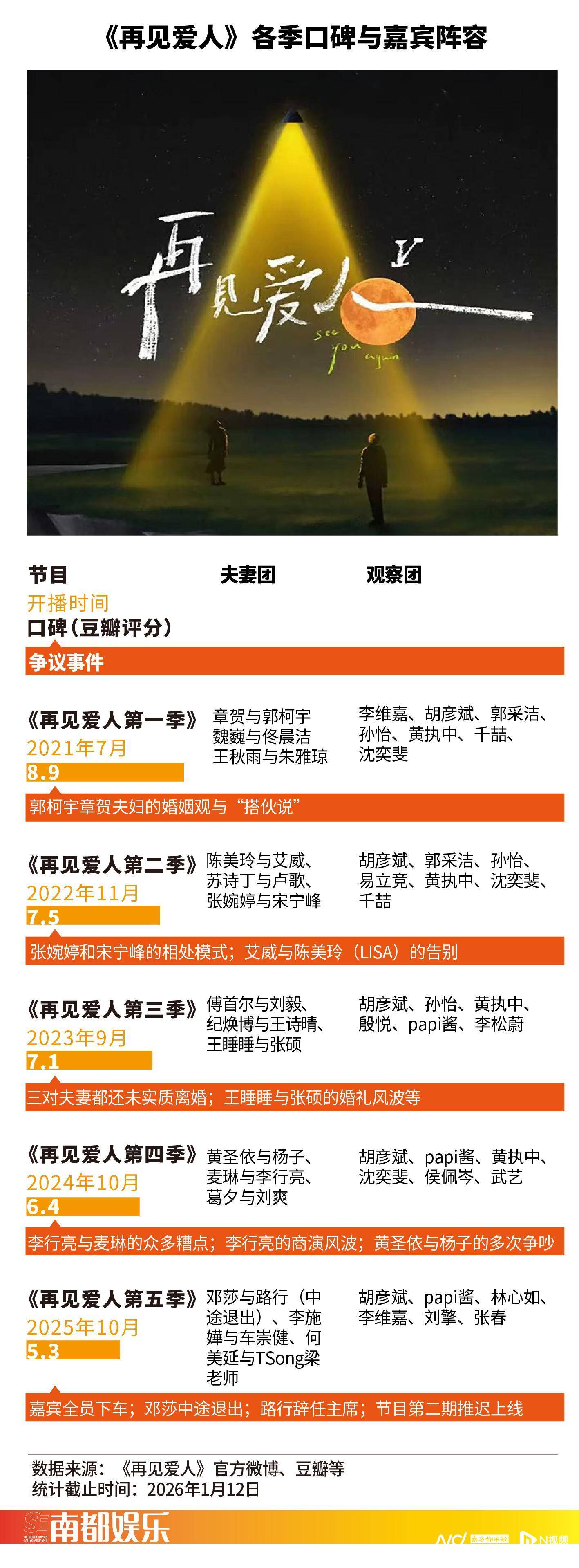 数据显示,从2021年起,《再见爱人》便以一年一更的进度和观众见面,但口碑却直线下滑:从第一季的豆瓣8.9分,到最新第五季的5.3,从郭柯宇章贺的“极致BE美学”,到邓莎路行的退出争议、观众直斥“憋屈”“作秀”“假圆满”,或许,这档热门话题不断的情感综艺经过5年时间,真的已变味。