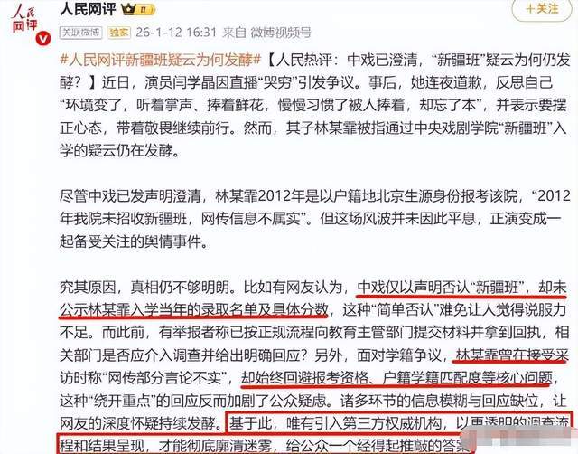 面对质疑,中央戏剧学院很快发了声明,说林傲霏是2012年以北京生源身份报考的普通本科班,当年学校根本没招新疆班,网传信息不实。可这个回应不仅没平息争议,反而让更多人起了疑心。有网友翻出林傲霏早年的采访,他明确说过“新疆分低,我就考的那个”,现在学校说没新疆班,这不是前后矛盾吗?