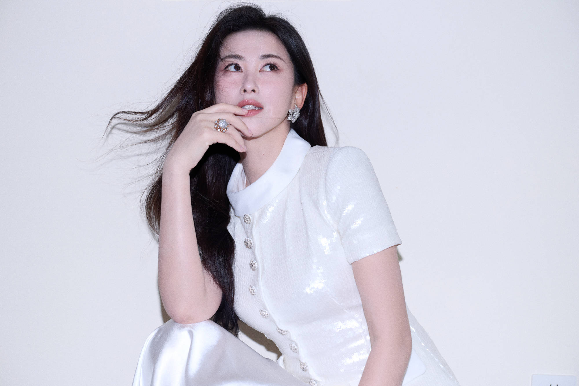 朱珠白亮片上衣搭缎面裙,手戴钻饰,姿态优雅松弛。