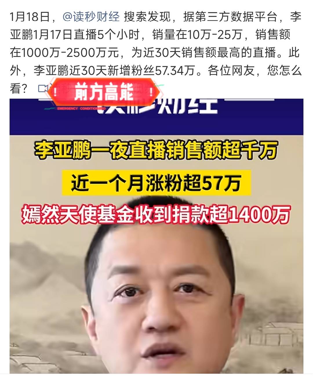 有人粗略统计过,仅1月17号一个晚上,李亚鹏上播了5小时,他的直播间卖了10万-20万件商品的销量,按照均价,李亚鹏直播间一晚上的流水,差不多在1000万—2500万之间,涨粉了50多万。