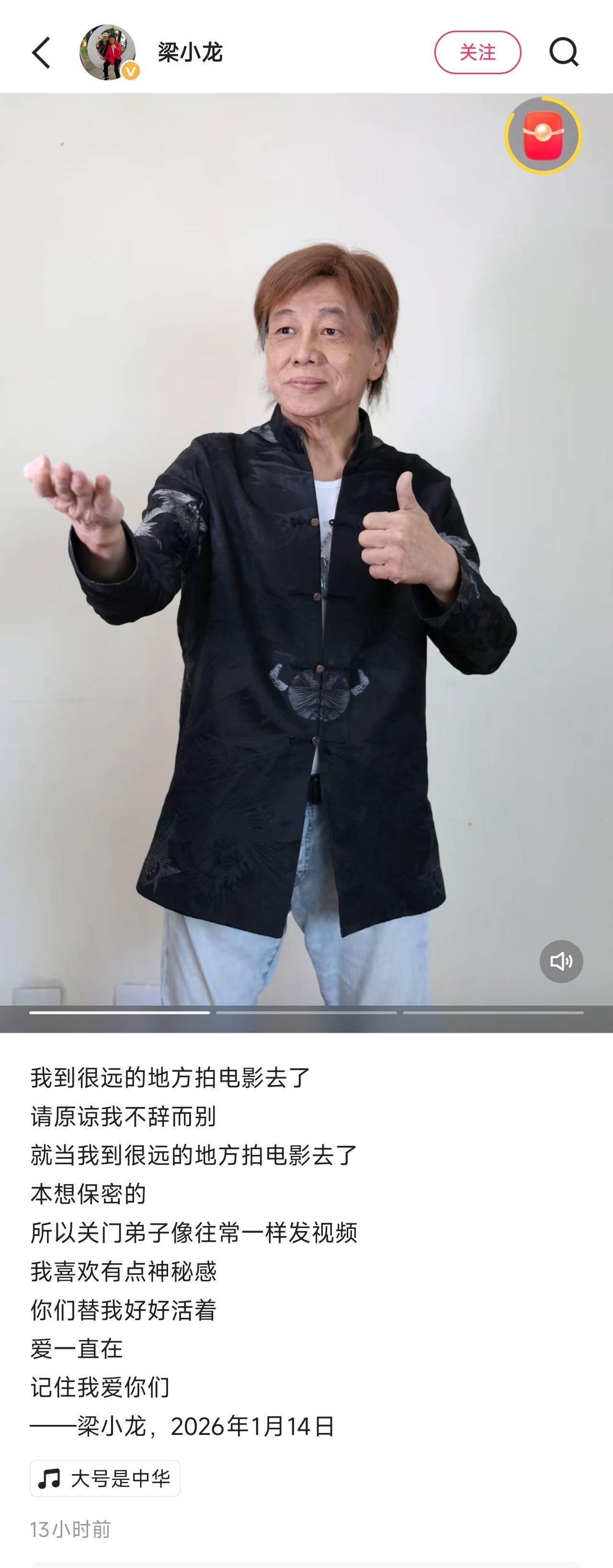 IT之家注意到,梁小龙的账号 1 月 18 日发文:“我到很远很远的地方拍电影去了。”请原谅我不辞而别,就当我到很远的地方拍电影去了,本想保密的,所以关门弟子像往常一样发视频,我喜欢有点神秘感,你们替我好好活着,爱一直在,记住我爱你们 —— 梁小龙,2026 年 1 月 14 日。