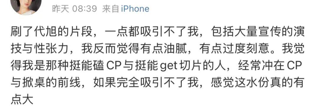 也有人吐槽是“戏里诈骗”,说正片里没有那些配上氛围感BGM的切片带感,觉得他年龄感上来了,站在个子更高、年纪更小、五官更标准的男主旁边,其实没有通稿夸的那么出众。