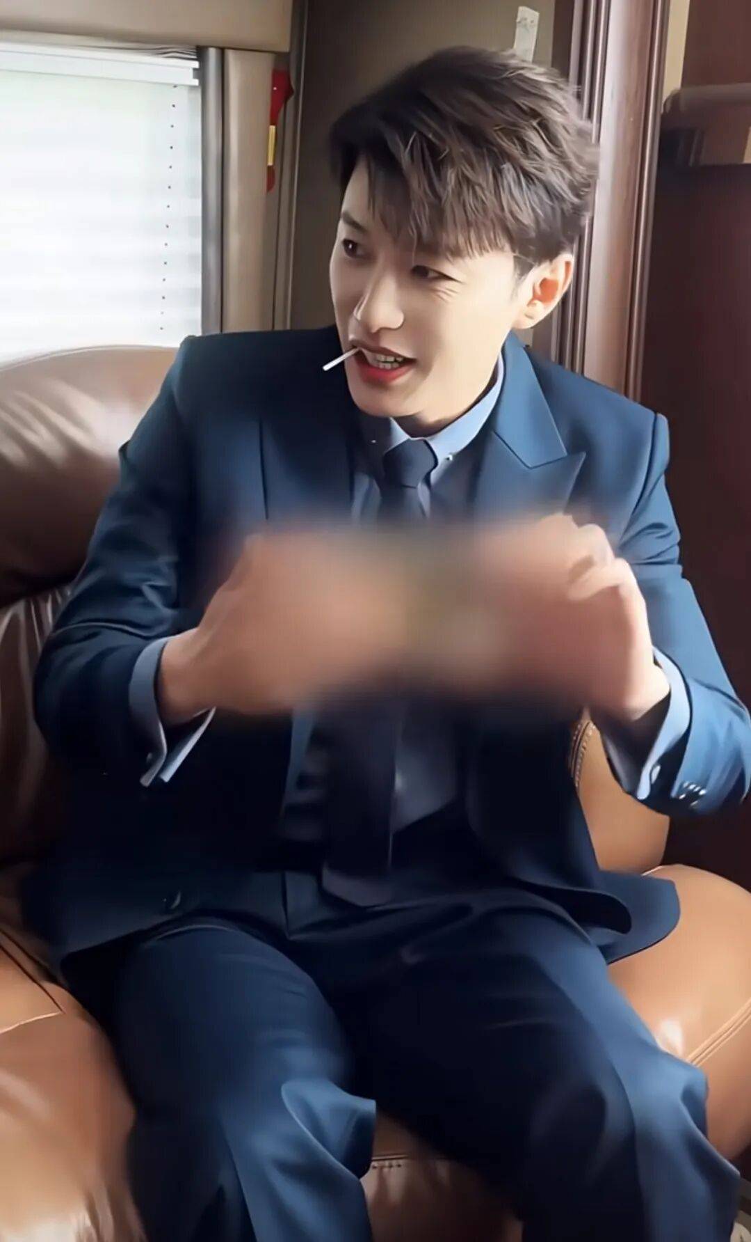 穿着一身霸总标配的西装吃棒棒糖。