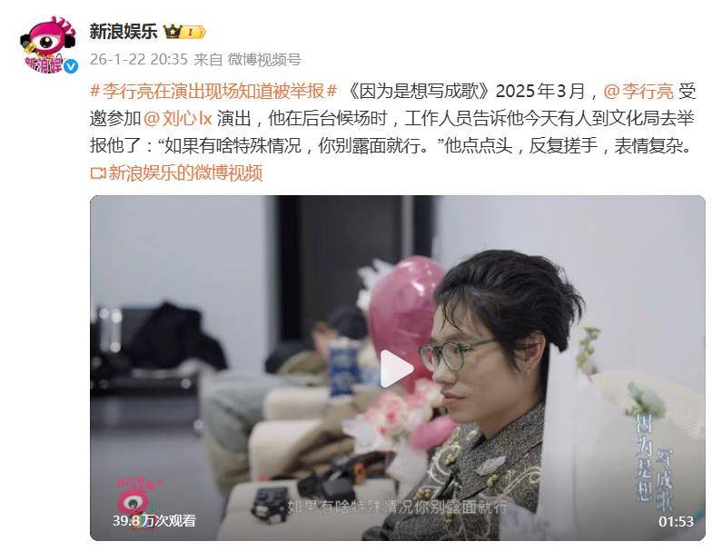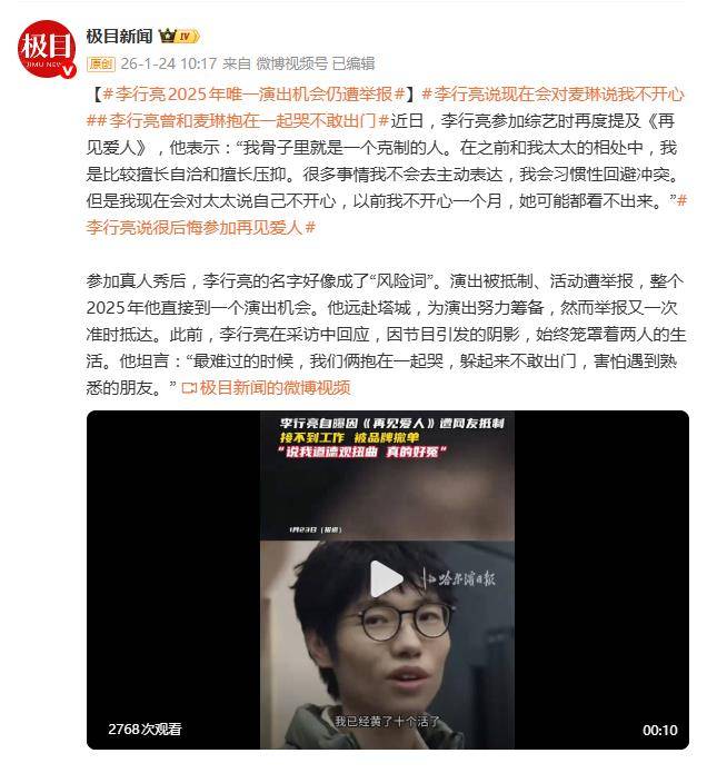 这一切的源头,是李行亮在节目中与妻子麦琳的相处模式被部分观众解读为“传播畸形价值观”。节目效应迅速溢出屏幕,演变成一场针对他个人的持久网络风暴。抵制从线上蔓延至线下,变得系统而精准:十余场已签约的演出因遭遇恶意举报接连被取消,典型案例是2025年在新疆塔城,他作为好友刘心巡演的助演嘉宾,已在后台完成妆发候场,却因举报电话打到当地文化部门,被临时通知“若有特殊情况别露面”,演出最终未开始即流产。这场流产的演出,竟成了他2025年全年唯一一次接近公开舞台的机会。
