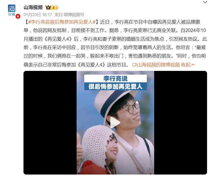 据1月24日报道,一句“非常后悔参加《再见爱人4》”,道尽了歌手李行亮过去一年多来的全部辛酸。自从在那档婚姻纪实观察真人秀中露面后,他的生活便从舞台中央滑向了舆论的暴风眼,不仅被贴上各种负面标签,更遭遇了组织化的网络抵制,直接导致其事业停摆,至今“已经黄了十个活”。