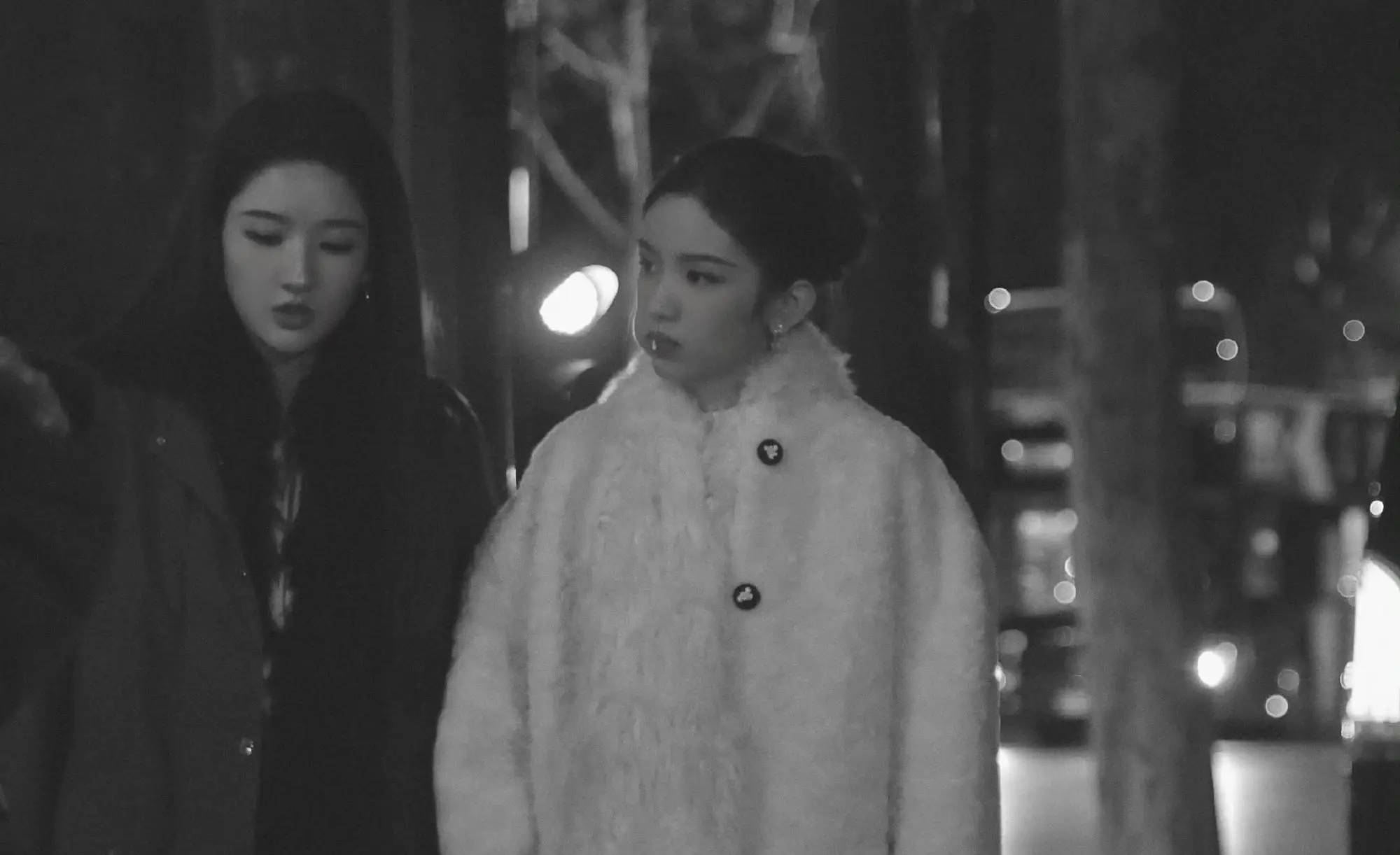 王玉雯与周也并肩而立,黑白光影中神态沉静。