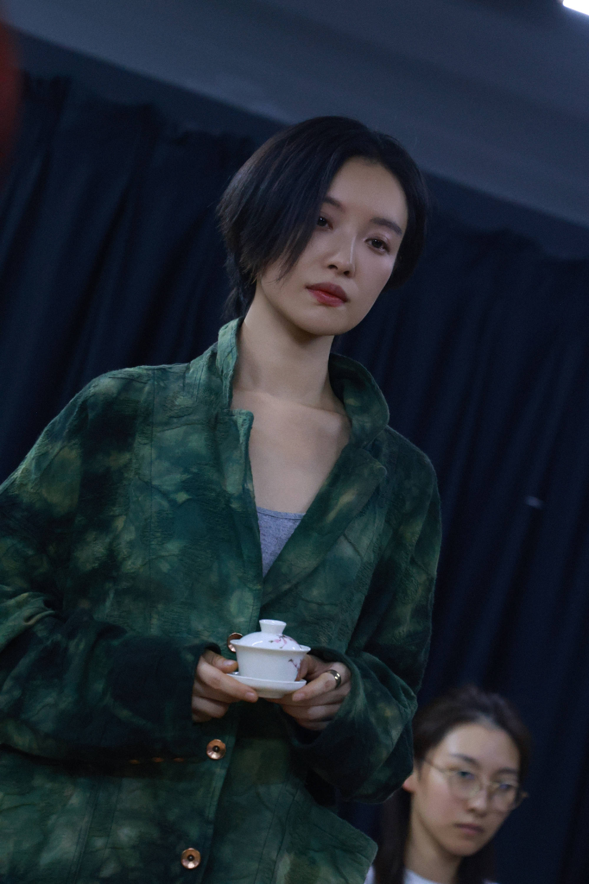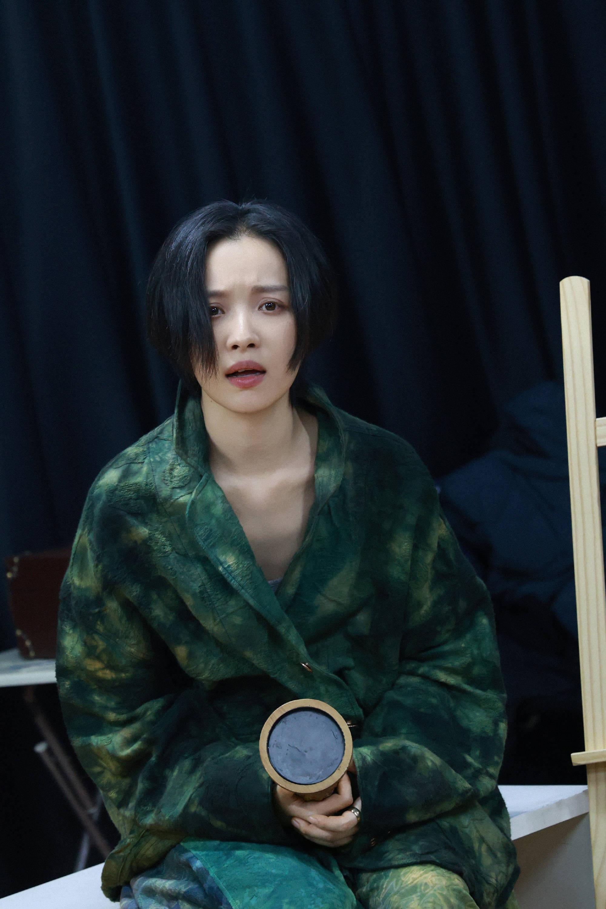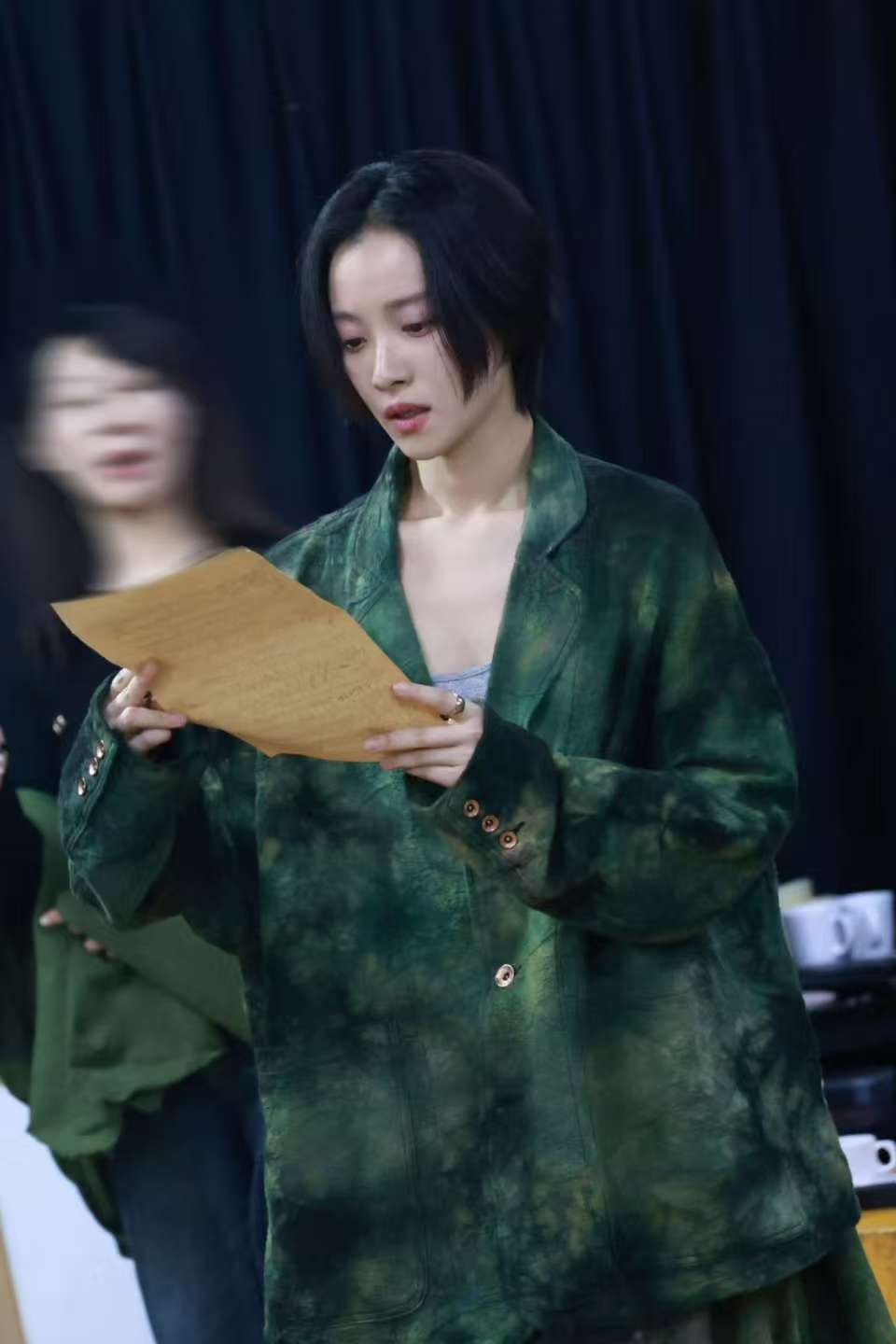 搜狐娱乐讯 近日,倪妮话剧排练照曝光,墨绿宽松西装搭利落短发,状态专注又投入。