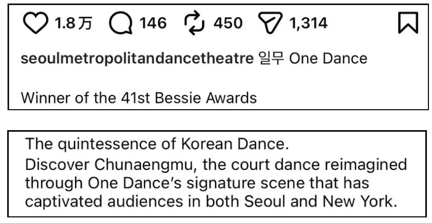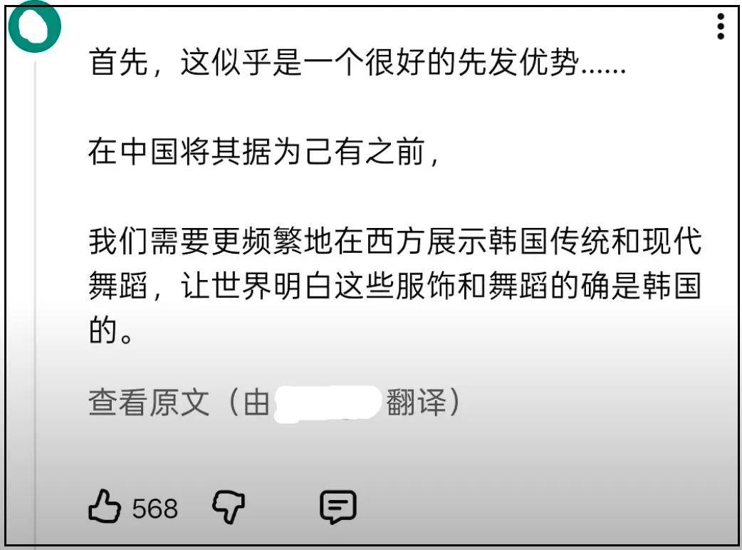 韩国舞团相关舞蹈片段之下,有条发布于2024年的韩语留言演都不演了,强调韩国舞团一定要到西方频繁展示,占据先发优势,这样就能把中国文化据为己有。