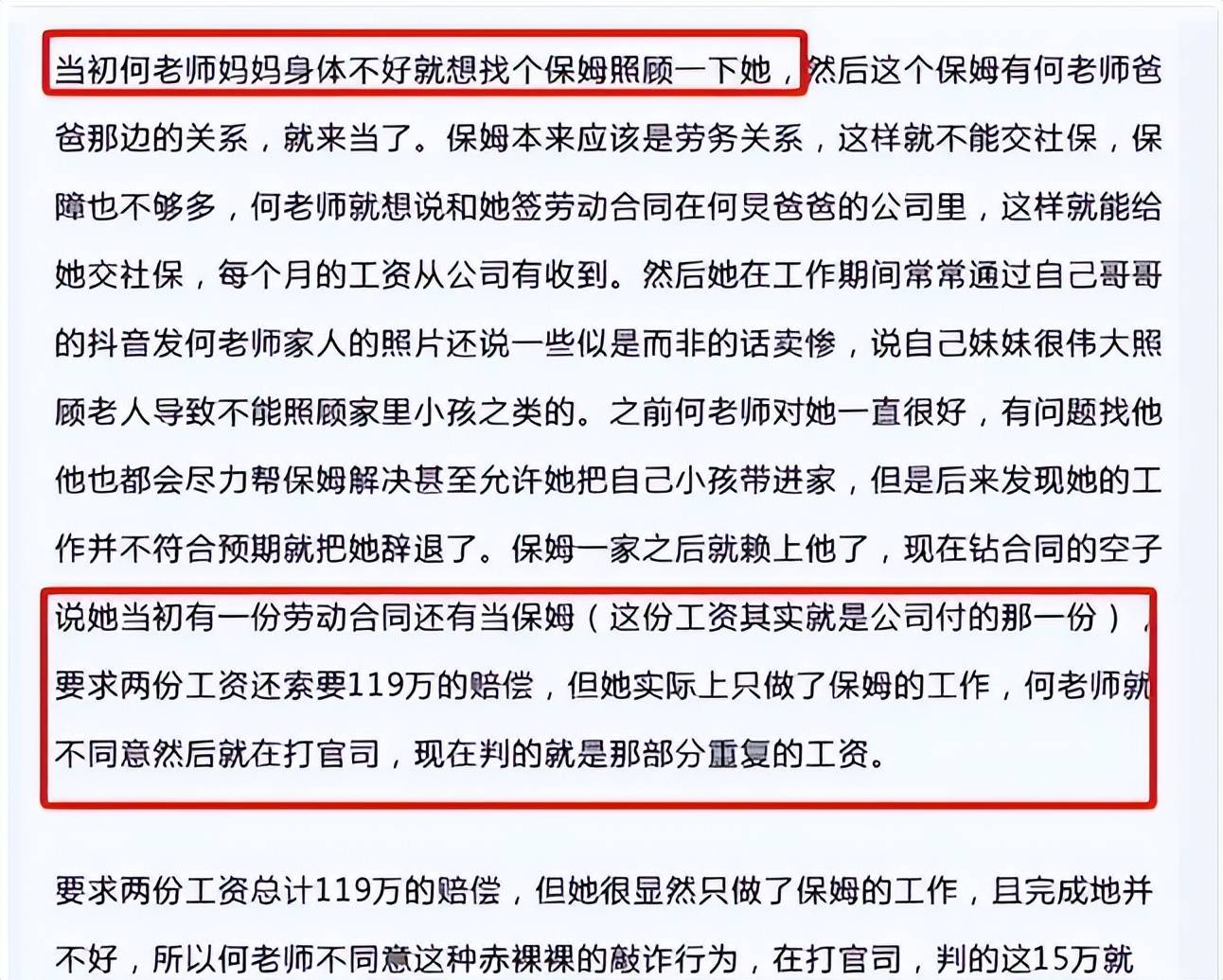 在遭到何炅合理拒绝后,保姆便策划了这场诉讼,让妹妹在社交平台声泪俱下地控诉,试图通过舆论施压逼迫何炅妥协。