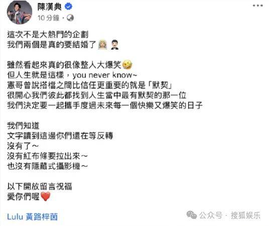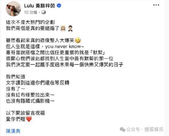 去年9月,陈汉典和同为主持人的Lulu黄路梓茵在社媒官宣结婚,因为过于突然,担心被外界认为是开玩笑,他们特意强调不是(整人)企划,而是“真的要结婚了”