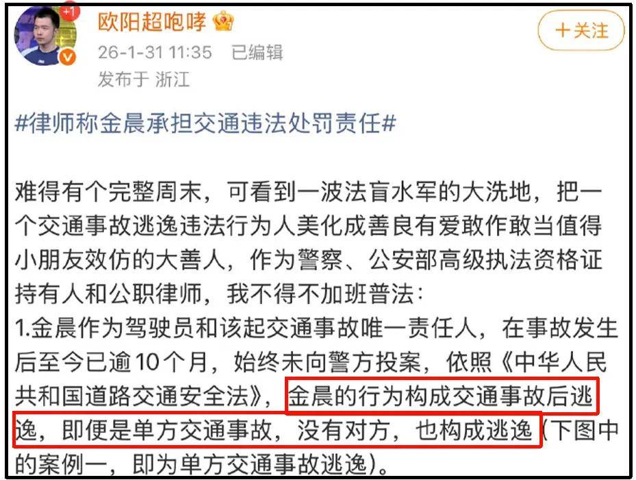 已经有业内站出来针对金晨的事件展开普法讨论,这位业内不是别人,正是做过警察的前《奇葩说》选手。他直言金晨的行为构成交通事故后逃逸。金晨作为驾驶员和事故中的唯一责任人,在事故后十多个月,始终没有向警方投案,已经构成逃逸。