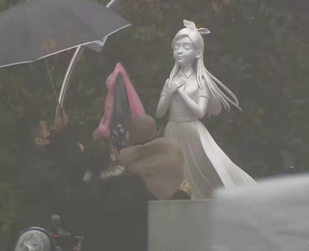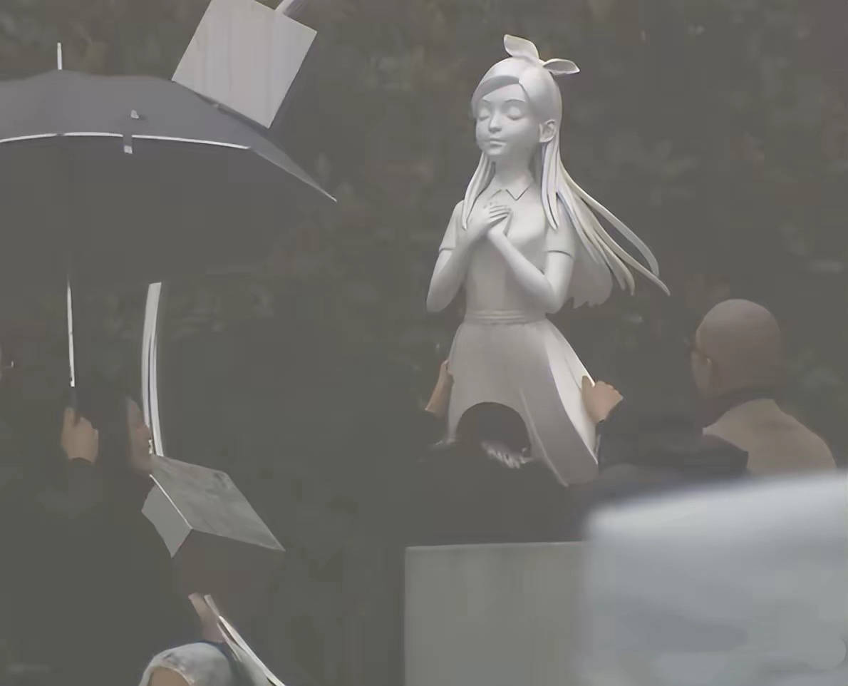 揭掉粉色面纱后,终于看到了具俊晔给大S设计的雕像。青春灵动像个小姑娘的模样,双手放在胸前、微微闭着眼睛。