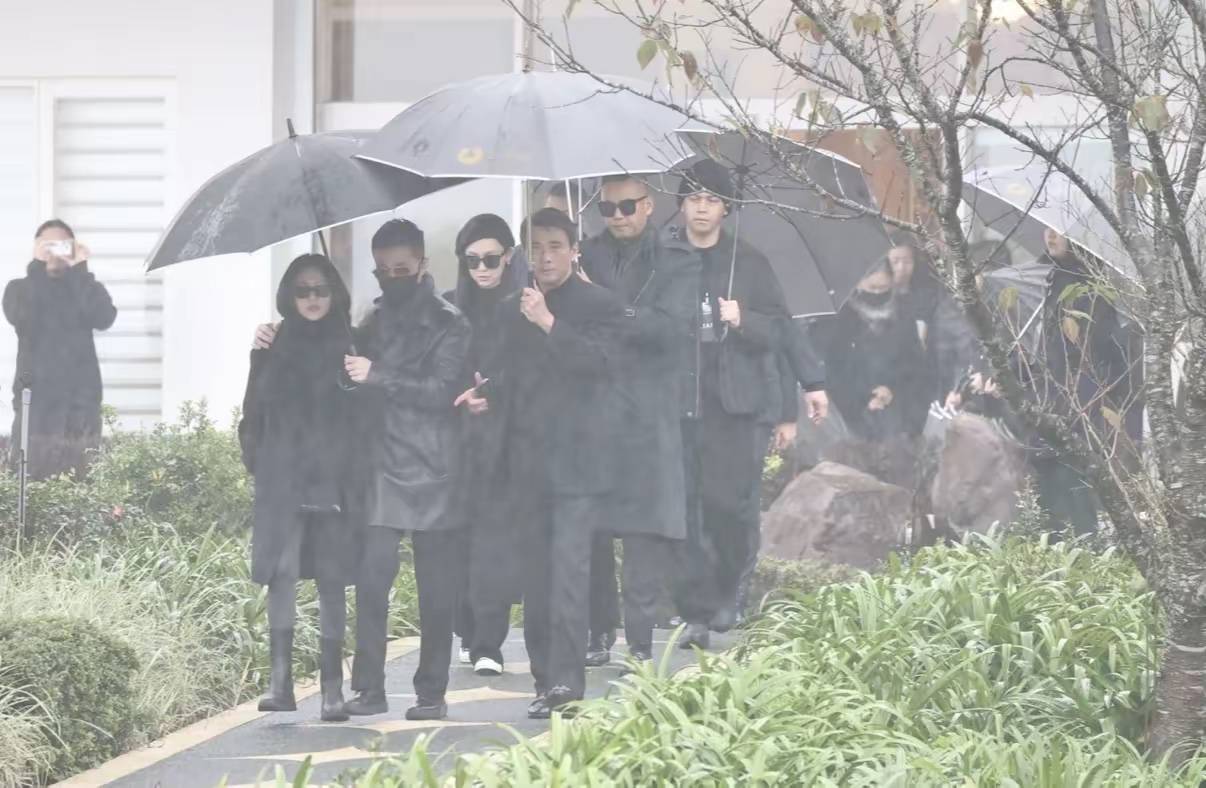 到场的人员,每个人都很悲伤。穿着黑色衣服,戴着黑色墨镜、撑着黑色雨伞。