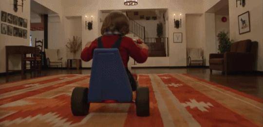 最经典的莫过于丹尼骑着三轮车在酒店空旷走廊中穿行的长镜头。