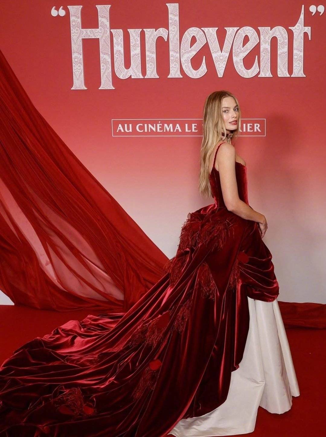 玛格特·罗比亮相新片《呼啸山庄》首映 酒红丝绒抹胸裙高贵优雅