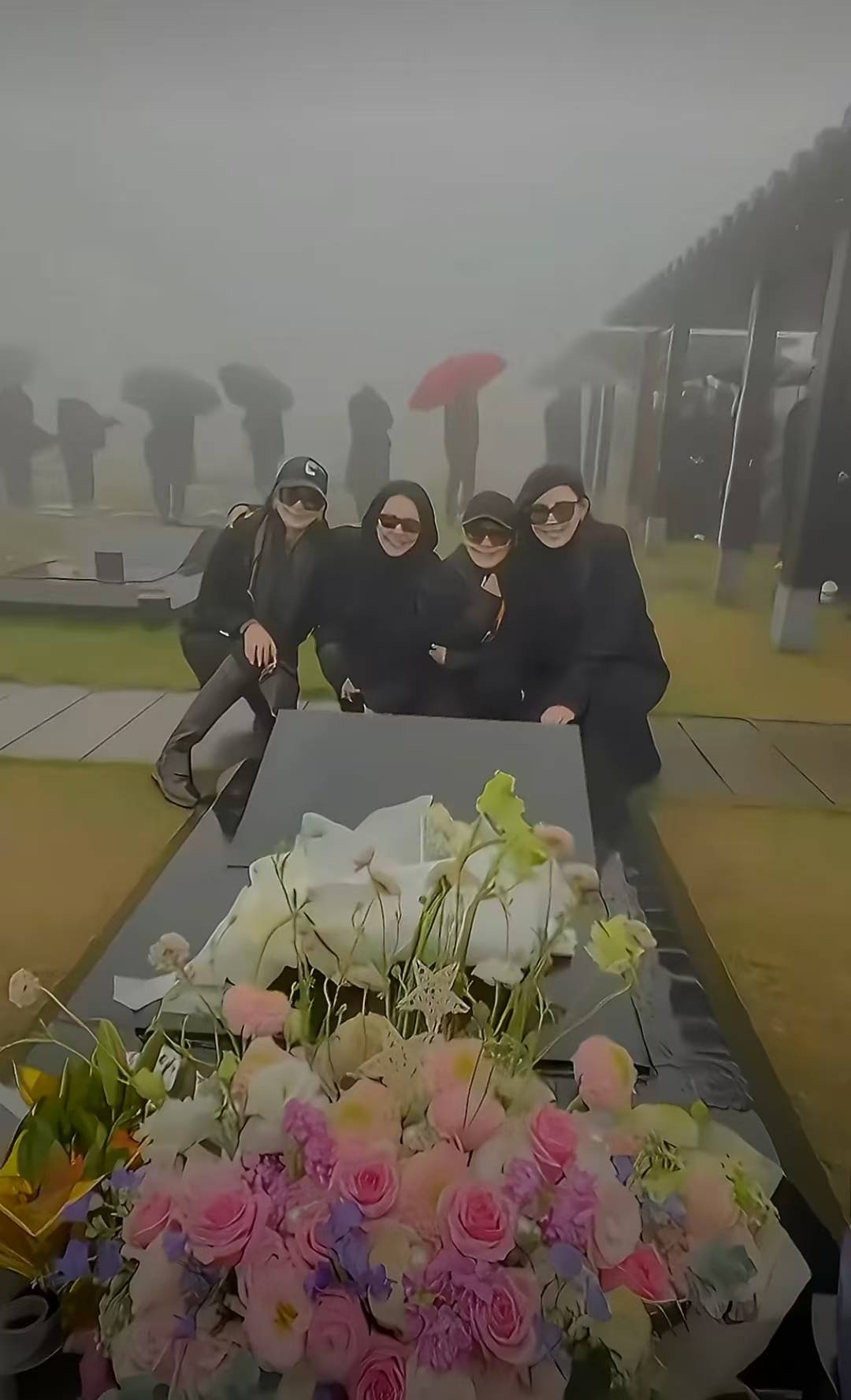 吴佩慈、小S、范晓萱、范玮琪在大S墓前合影。