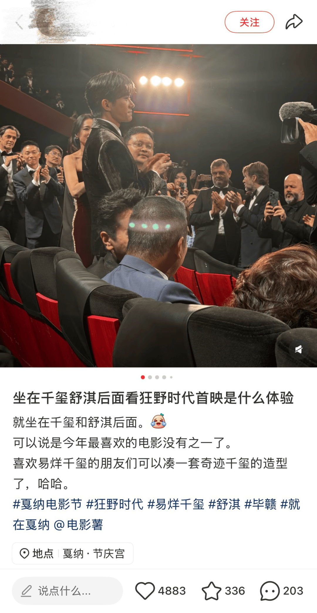2025年戛纳电影节期间,身处现场的媒体人、影迷甚至留学生,都成为分享独家见闻的小红书「人脉」。影迷类达人专注影展片单,发出了第一波观影repo;留学生多为旅游&生活类达人,用第一视角带大家打开海外电影节,诠释了电影生活方式;还有不少用户放大了小红书的「偶遇体裁」——在戛纳红毯候场、甚至街道餐厅,偶遇了舒淇、李庚希、易烊千玺等演员。甚至有用户带来新视角「坐在千玺舒淇后面看狂野时代首映是什么体验」。这些内容不仅为小红书用户带来独家一手资讯,更是传递了一种「我在现场」的信任感。