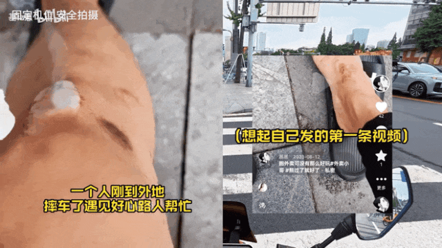 他在外地骑车摔倒了,就有好心人帮着上药。