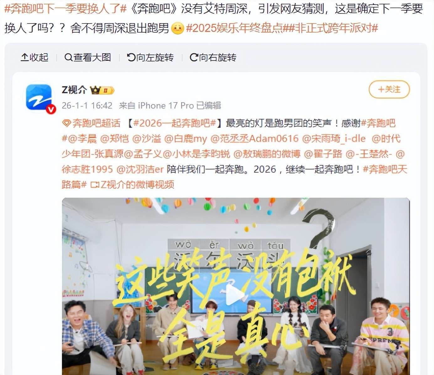 紧接着,在1月1日,《奔跑吧》官方发布了一条消息,艾特了参与录制的多位明星。然而,细心的网友们发现,官方并没有艾特周深,这让大家忍不住猜测:下一季《奔跑吧》难道没有周深吗?周深作为一名歌手,他的性格温和,极具亲和力,而且每次参与综艺节目的录制时,都全力以赴,所以很多观众也是冲着周深去看的。如果他真的退出,粉丝们自然会感到不舍与遗憾。