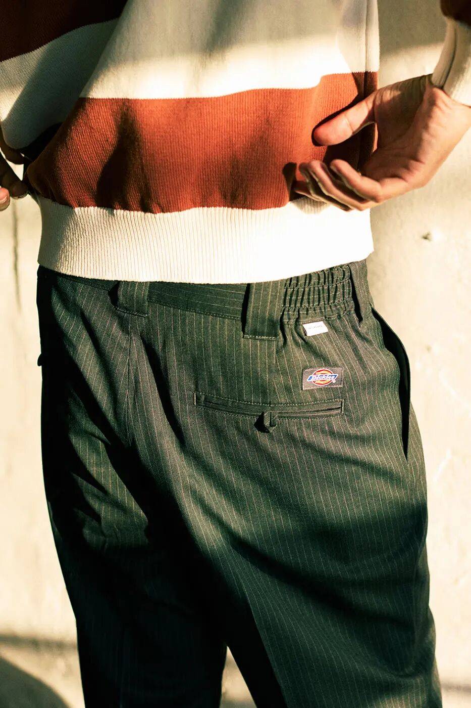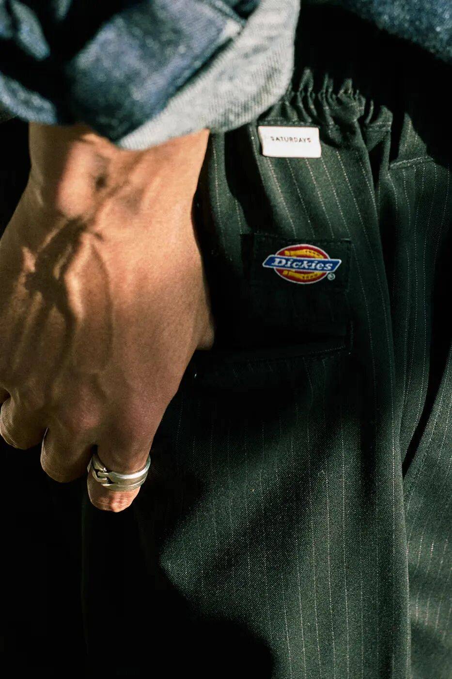 本次联名聚焦两种不同剪裁,充分展现双方的设计优势。其一是一款全长西裤式长裤,以干净利落的外观营造更高级的视觉印象,将传统工装裤转化为适合城市日常穿着的多功能单品。在延续 Dickies 标志性结构与耐用度的同时,整体轮廓明显向 Saturdays NYC 更偏修身、精致的审美靠拢。