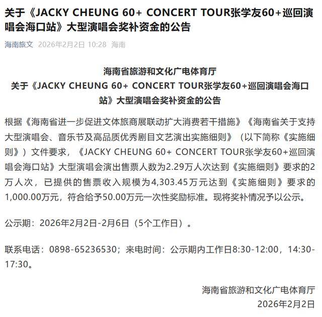 据公告,根据海南相关文件要求,《JACKY CHEUNG 60+ CONCERT TOUR张学友60+巡回演唱会海口站》大型演唱会演出售票人数为2.29万人次达到《实施细则》要求的2万人次,已提供的售票收入规模为4,303.45万元达到《实施细则》要求的1,000.00万元,符合给予50.00万元一次性奖励标准。现将奖补情况予以公示。